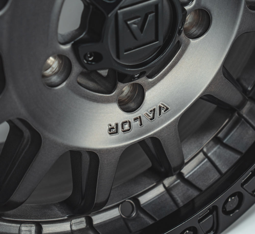 The Brushed Charcoal paint finish on the Valor Offroad V09 Flow Formed UTV wheel is unlike any wheel in the industry. Each wheel is meticulously brushed to expose the grain of the aluminum alloy. The wheel is then sent to paint booth to get a super thick coat of charcoal tinted clear coat.
