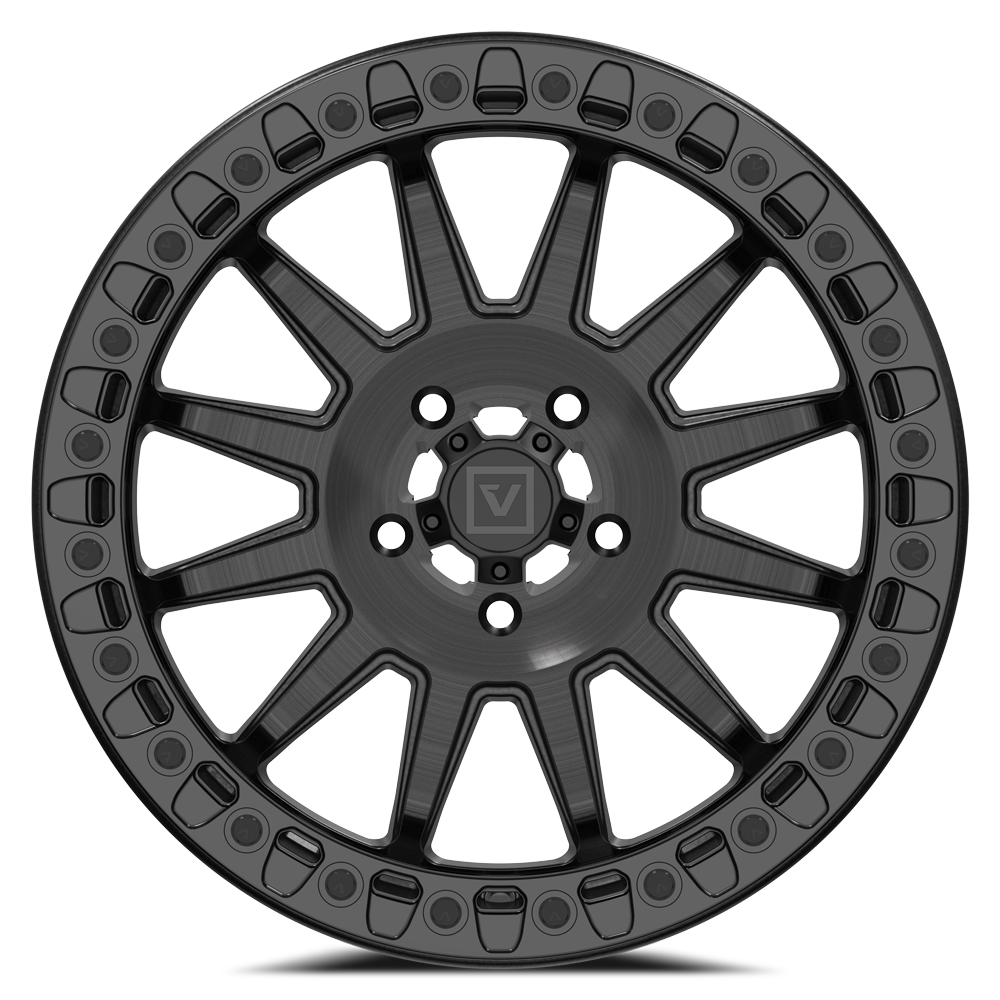 The V09 Brushed Charcoal finish features textured brushed aluminum with dark charcoal tint. Gloss black billet beadlock ring. Gloss black cap with matching Valor Offroad logo