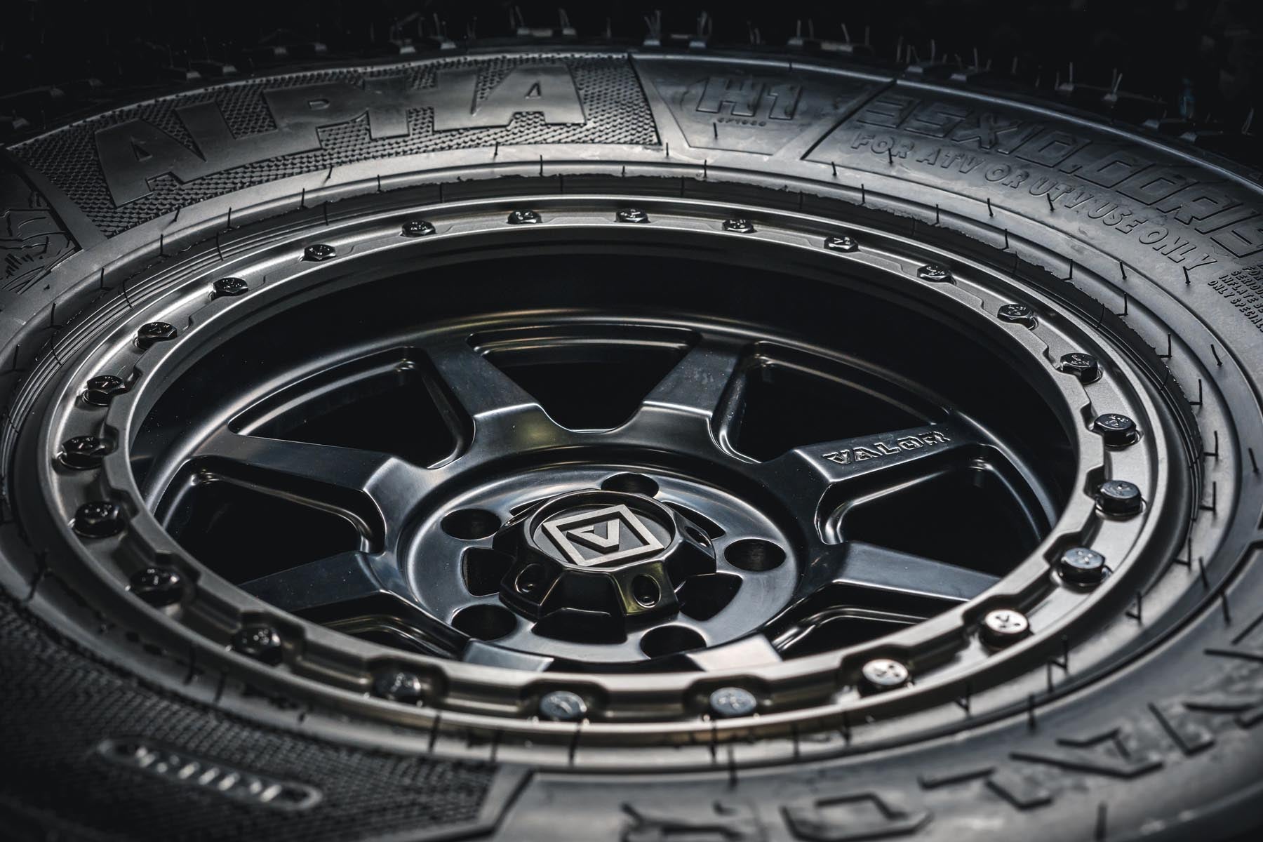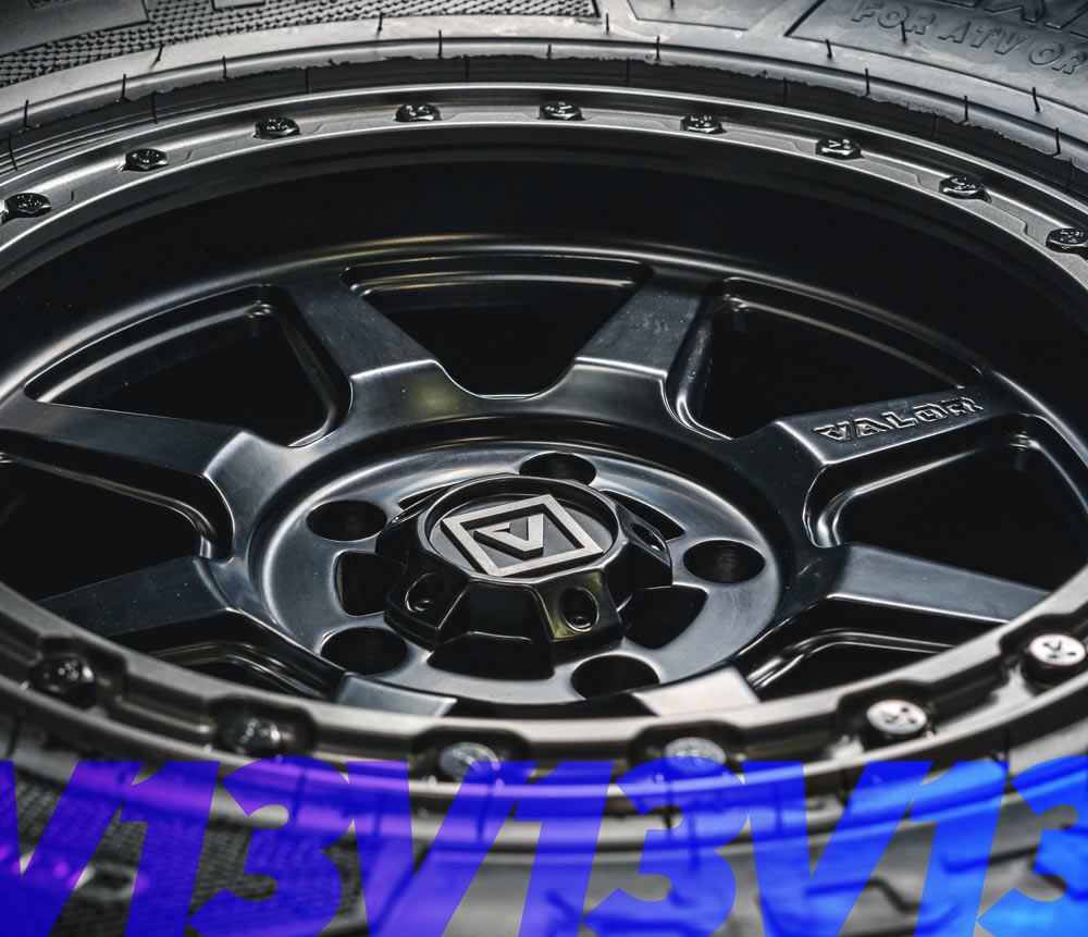The satin black paint finish on the Valor Offroad V13 UTV Wheel was developed to withstand any kind of punishment you can sling at it. Scratches happen (we think of them as badges of honor) but know your paint will hold up under normal wear and tear with routine care.