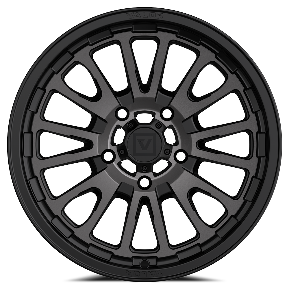 The V14 has a unique eight split spoke design with a recessed outer lip. Debossed Valor logo on lip. Bolt-on center cap with satin graphite logo.