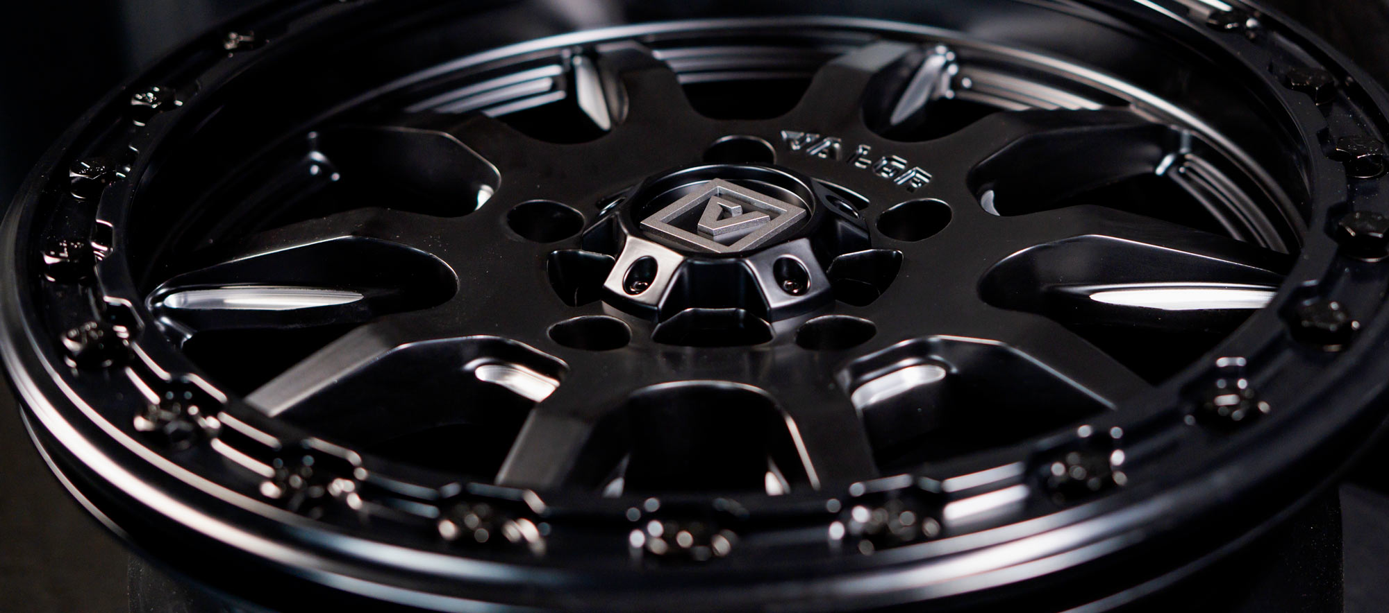 The V15 beadlock utv wheel comes stock with ABS satin black center cap with satin charcoal logo. The V15 wheel features a billet beadlock ring in satin black paint. All Installation hardware is satin black.